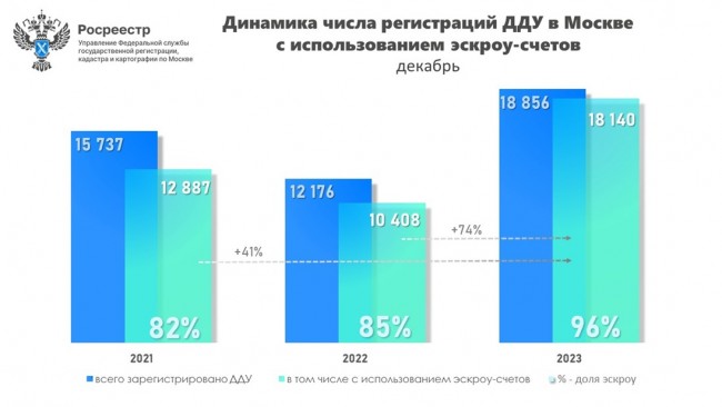 В декабре 2023 года Управлением Росреестра по Москве зарегистрировано 18 140 договоров с применением эскроу-счетов, что составило 96% от общего числа договоров на первичном рынке (18 856 ДДУ).