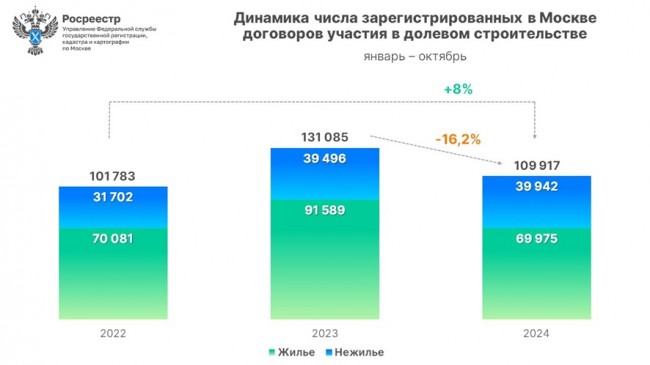 Всего в январе-октябре 2024 года в Москве зарегистрировано 109 917 ДДУ в отношении жилой и нежилой недвижимости. Данный показатель снизился на 16,2% к десяти месяцам 2023 года (131 085 ДДУ), но на 8% больше результата за аналогичный период 2022 года (101 783 ДДУ).
