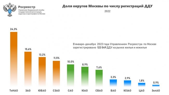 «Всего в 2022 году в ТиНАО оформлено 24,3% или 29 688 ДДУ от всех первичных договоров. Вторую строчку рейтинга по результатам года занял ЗАО, где зарегистрировали 15,6% (18 976 ДДУ), на третьем месте - ЮВАО с 13,2% (16 134 ДДУ). Суммарно на тройку лидеров пришлось 53,1% всех регистраций ДДУ в Москве по итогам года»,— комментирует Игорь Майданов, руководитель Управления Росреестра по Москве.