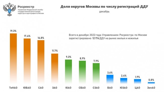 В декабре 2022 года в Троицком и Новомосковском административных округах (ТиНАО) зарегистрировано 19,3% (2 347 ДДУ) первичных сделок. Второе место, как и месяцем ранее, занял Юго-Восточный административный округ (ЮВАО) с 17,4% (2 116 ДДУ). Тройку лидеров, поднявшись с шестой строчки в ноябре, закрыл Северный административный округ (САО), где за месяц оформили 16,8% (2 040 ДДУ).