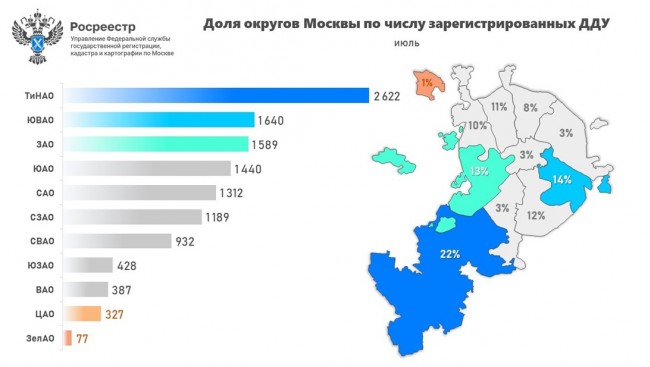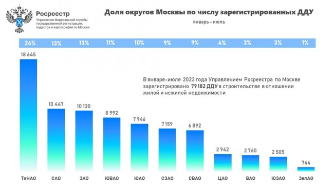 «По результатам семи месяцев текущего года в столице оформлено свыше 79 тысяч долевых договоров, из них 18 645 ДДУ в ТиНАО, что составило 23,6% от общего числа регистраций первичных сделок в Москве с начала этого года. На втором месте с 13,2% (10 447 ДДУ) оказался САО, а на третьей строчке рейтинга ЗАО, где зарегистрировано 12,8% (10 130 ДДУ)»,— комментирует Игорь Майданов, руководитель Управления Росреестра по Москве.